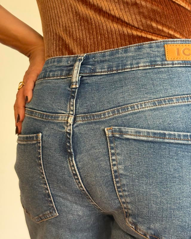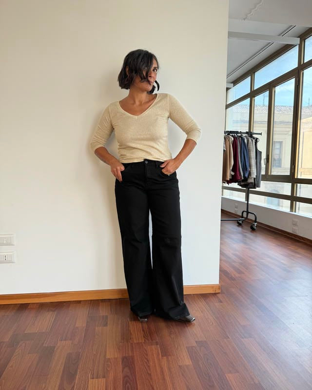 La modella in foto indossa la taglia 30 che corrisponde ad una 44 italiana.
