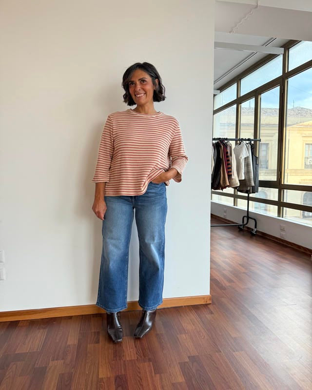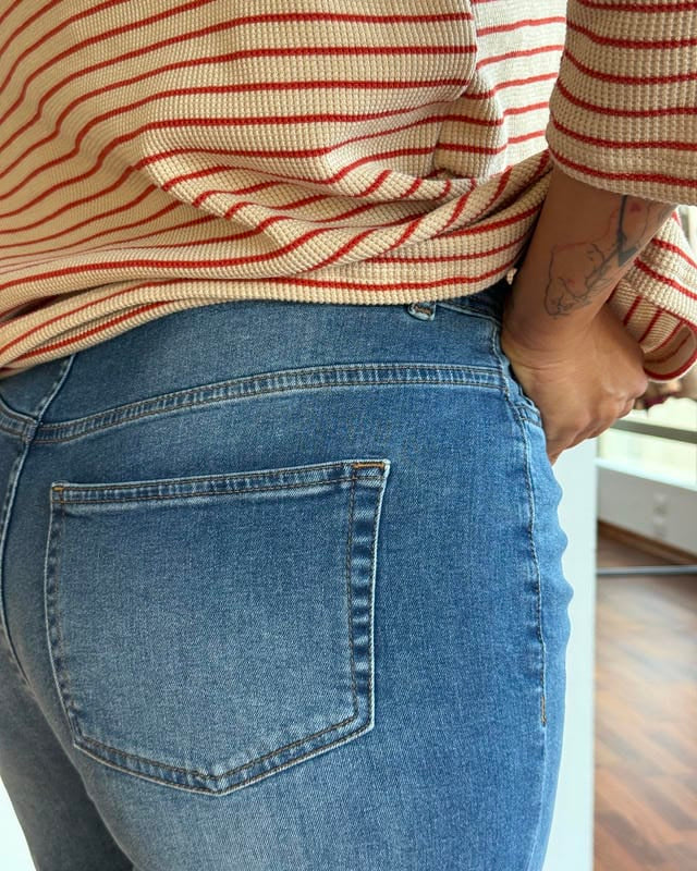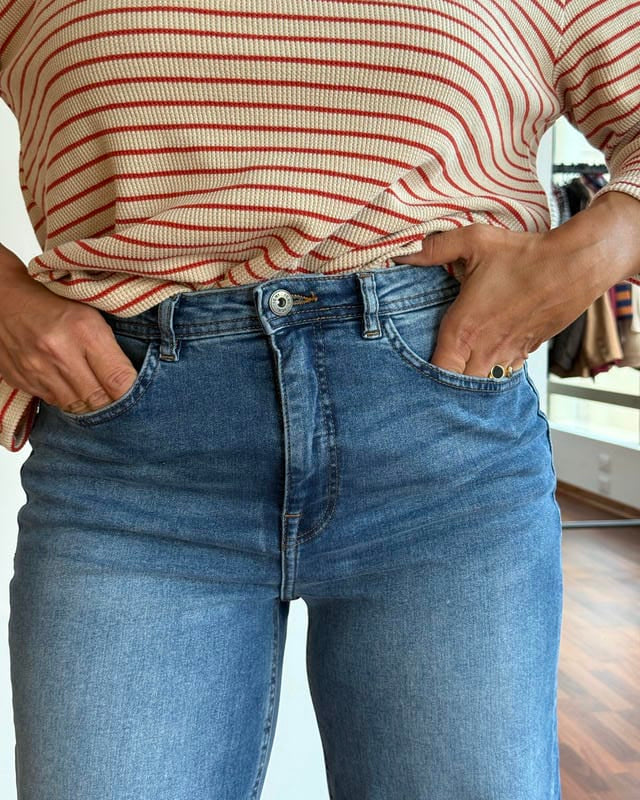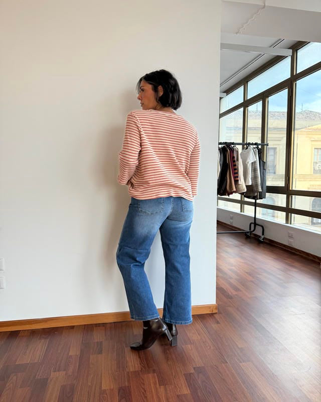 La modella in foto indossa la taglia 30 che corrisponde ad una 44 italiana.