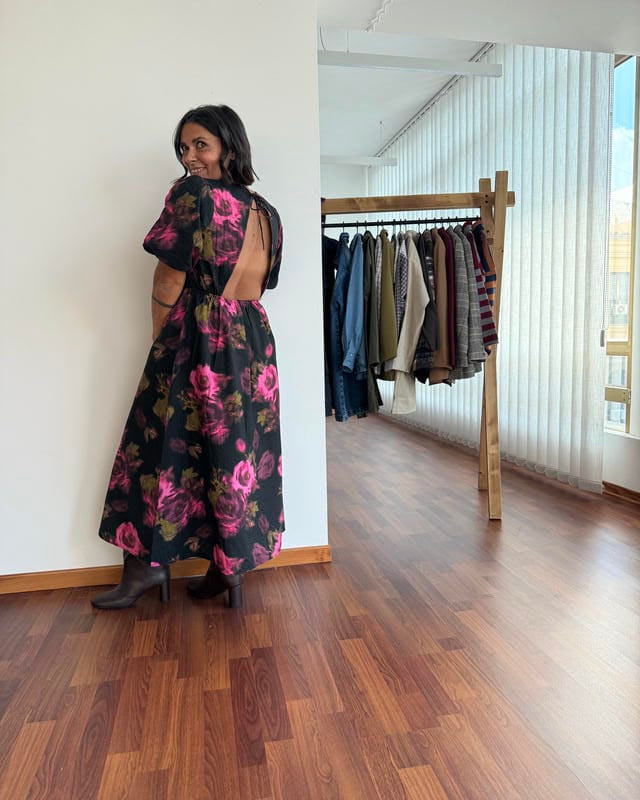 Abito in viscosa strutturata a base nera con fiori fucsia e color olio.